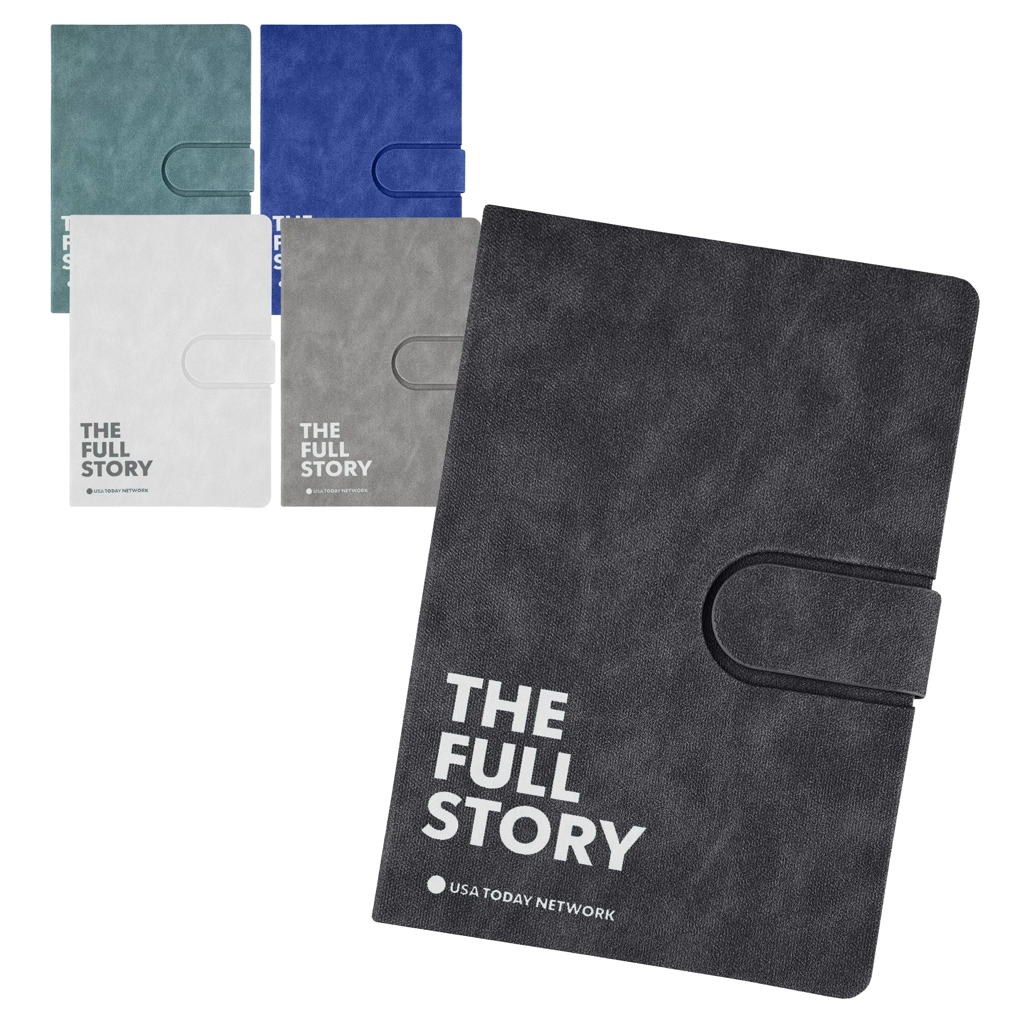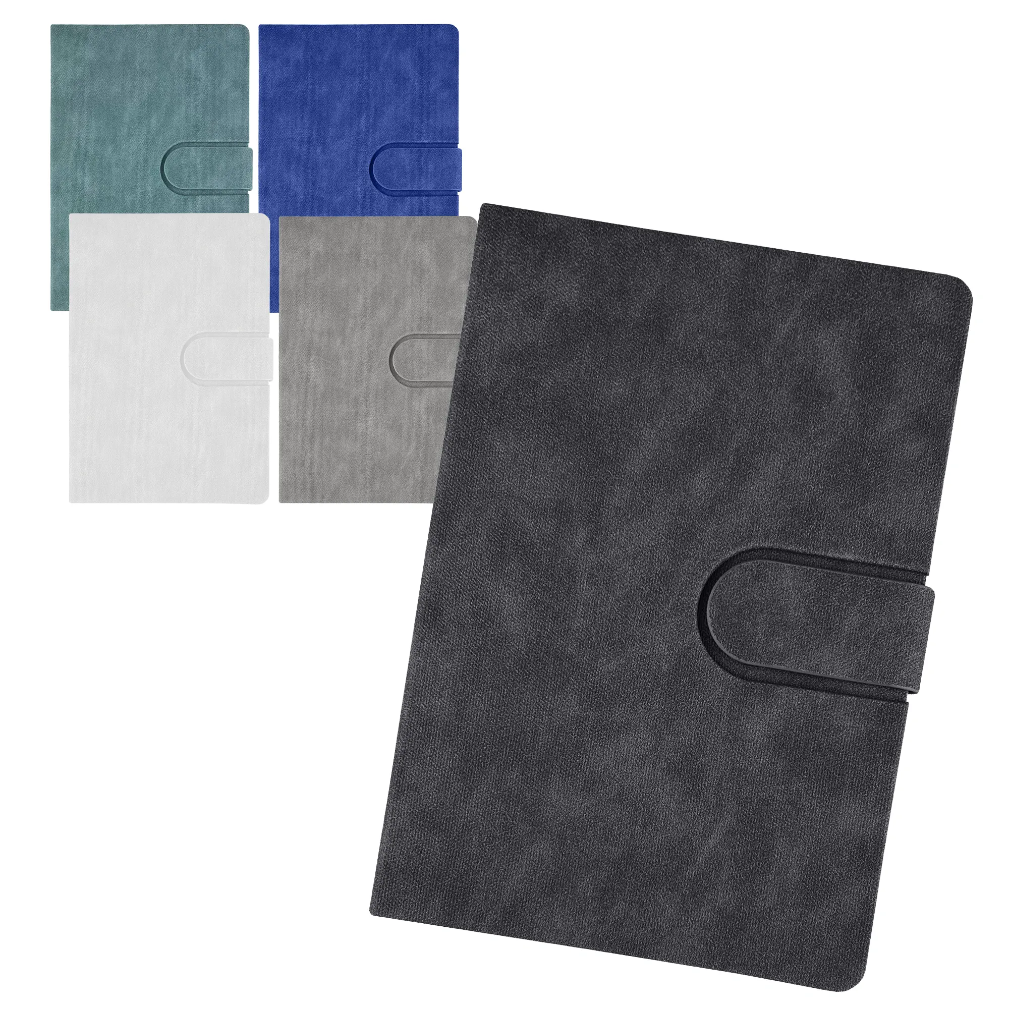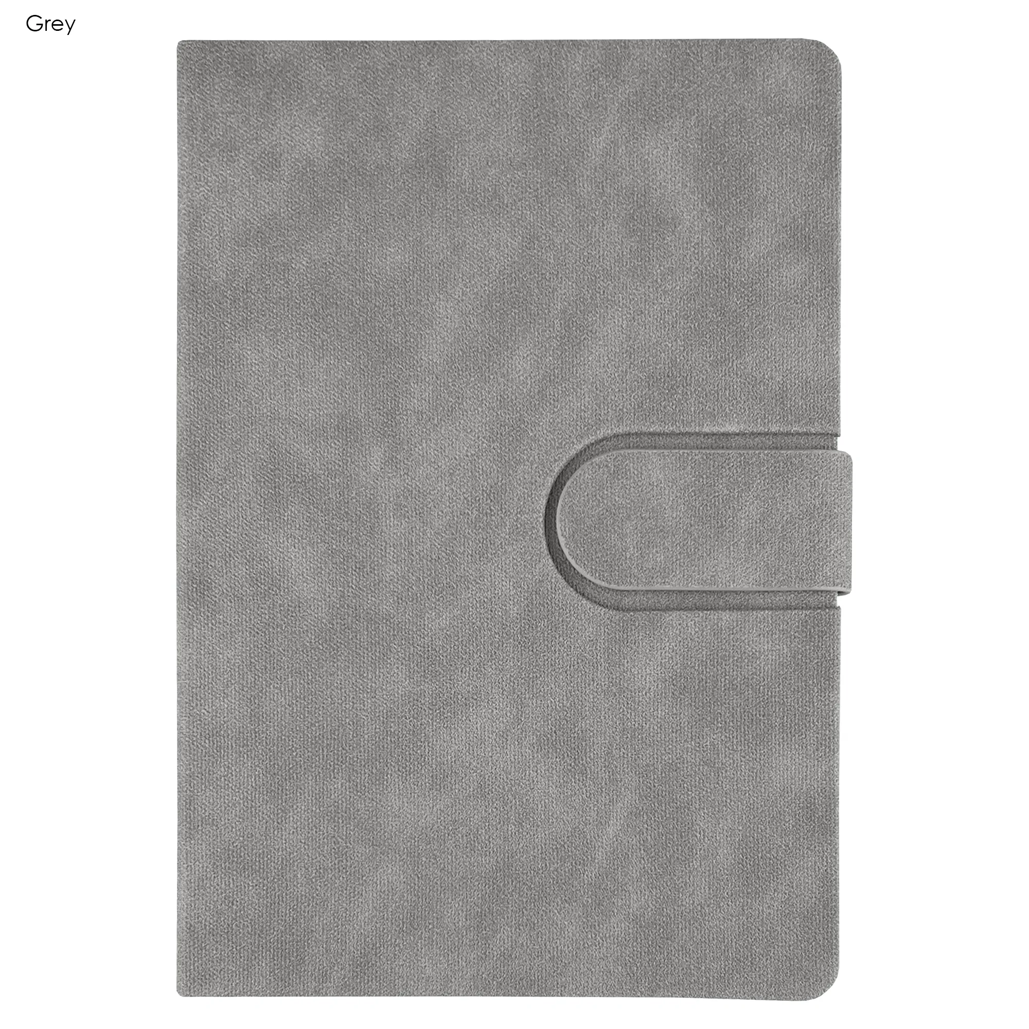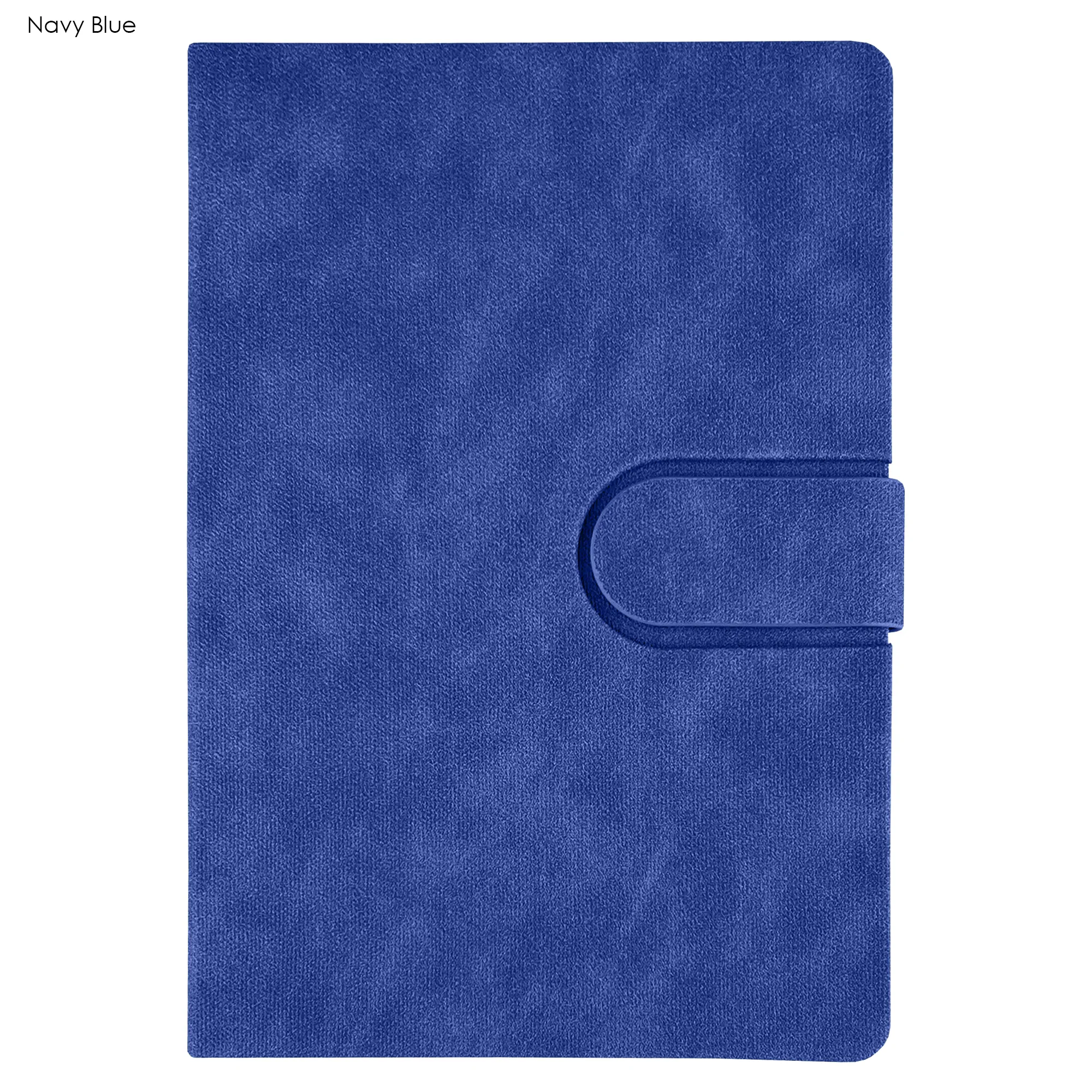 Full Description: Modern design A5 notebook with hard PU leather cover with magnetic flip closure. 80 leaves (160 pages) of 80gsm lined off-white pages and matching colour fabric bookmark.