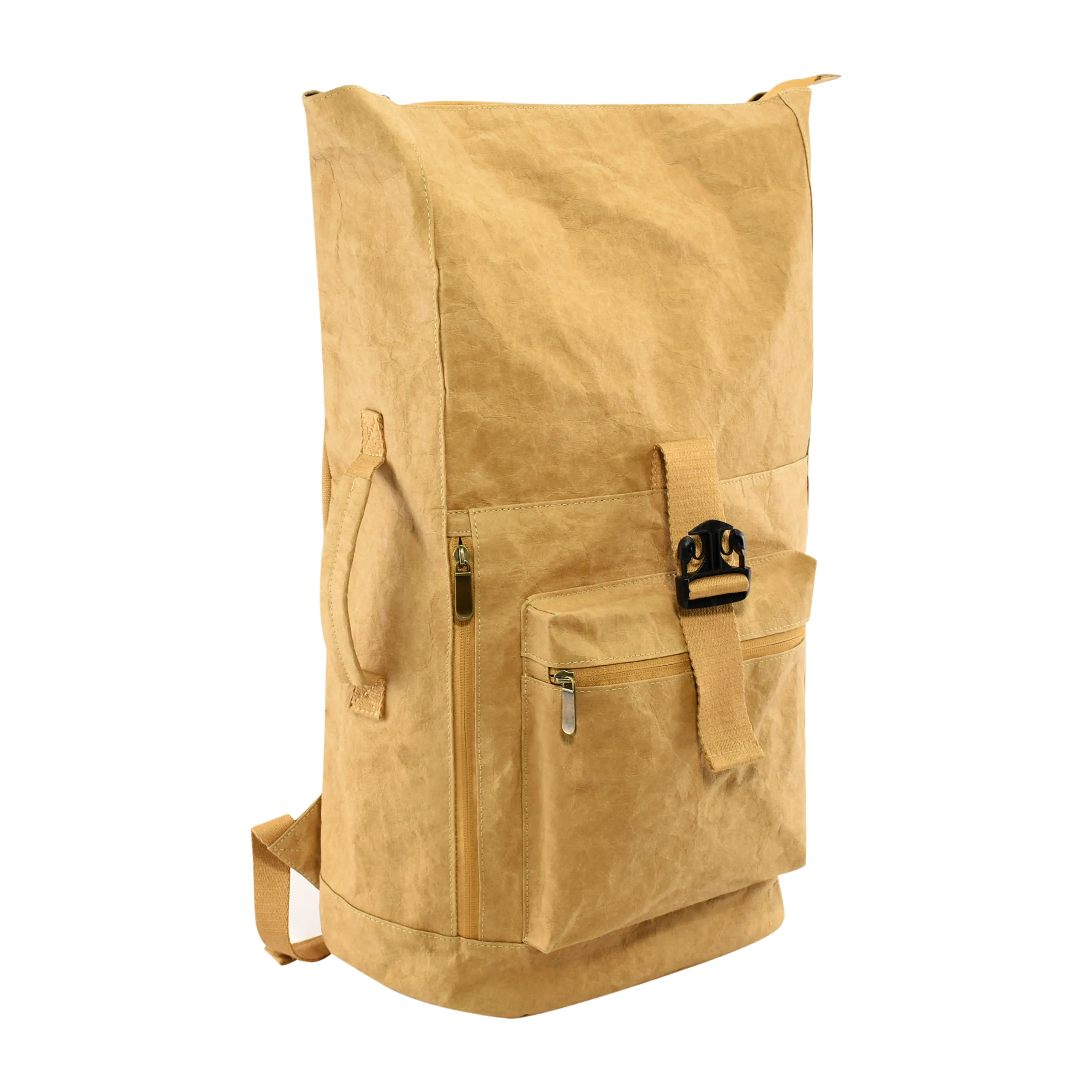 Full Description: This 0.55mm thick German pre-washed brown washable kraft paper backpack combines a mix of durable and eco-friendly materials with various practical features to make it suitable for everyday use, work, school, or travel. Kraft paper is lightweight with high tear resistance, made of natural wooden fiber and synthetic latex. It has a 70D polyester inner liner and top zip closure. The bag features zip closure on the bag top and also buckle closure, polyester cotton webbing handle, brown canvas adjustable shoulder strap, 2 zip pockets inside, a laptop compartment and one water bottle pocket on side. The washable kraft paper exterior adds a unique and stylish touch while also ensuring it can withstand regular use and occasional washing.