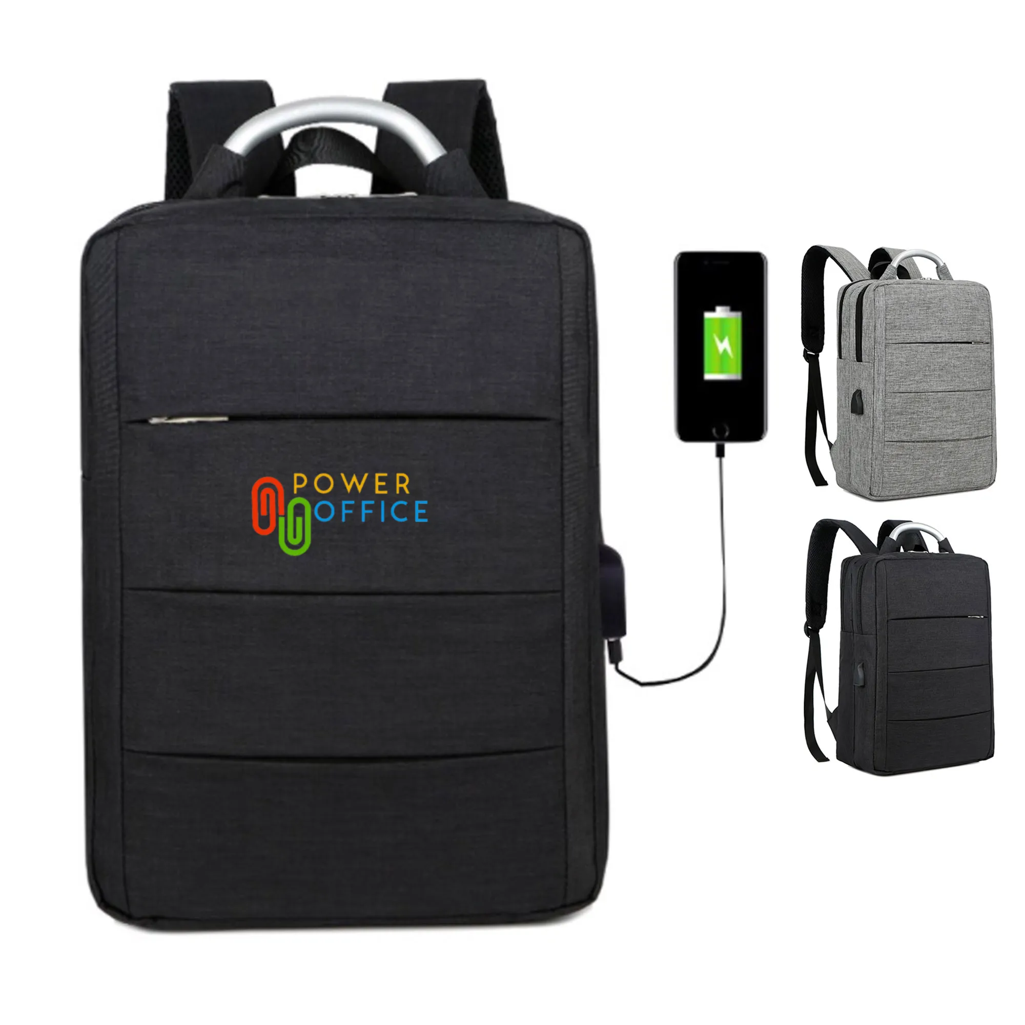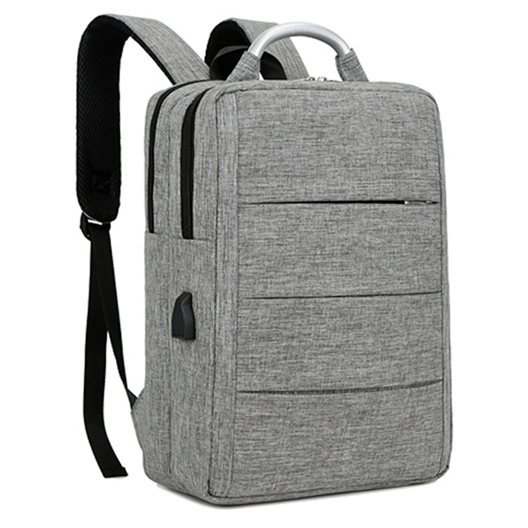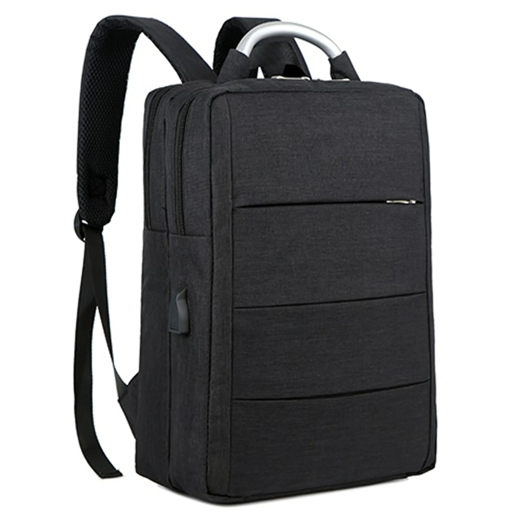 Full Description: This modern stylish laptop backpack is made from high quality sponge nylon, and has one front zipped pouch. The bag is combined with 2 complete independent front and back compartments front compartment has 2 small pouches and a pen holder, the back compartment has a large pouch with black velcro closure strap for laptop and iPad , this pouch is padded thicker to protect inside laptop and iPad. It also features USB charging port with a charging cord attached, and adjustable straps. Bag has a zip closure top for both compartments, an aluminum handle in the middle is for you to carry the bag by hand.