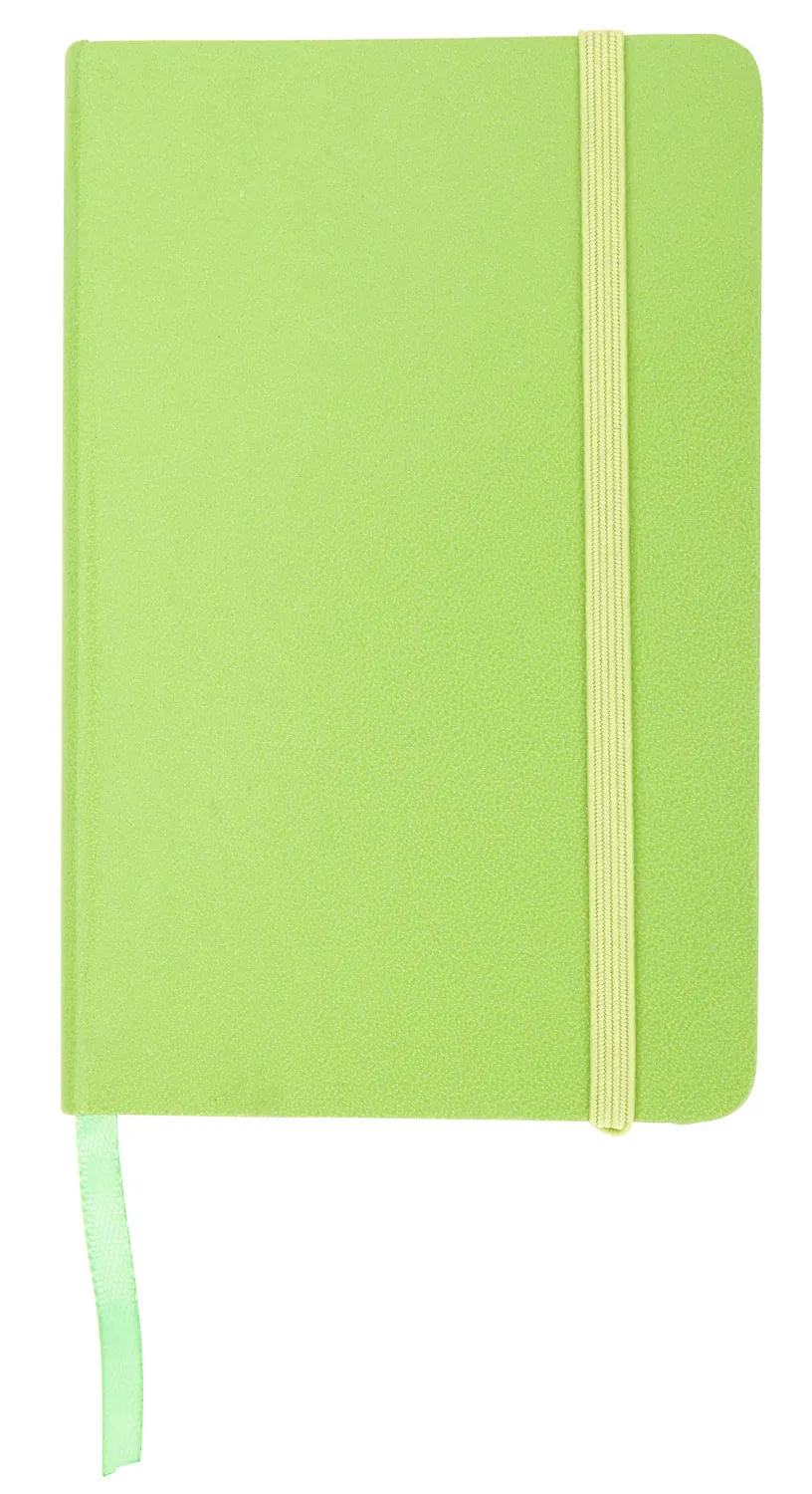 A6 Leather look cover notebook with expandable pocket on back page and elastic band closure