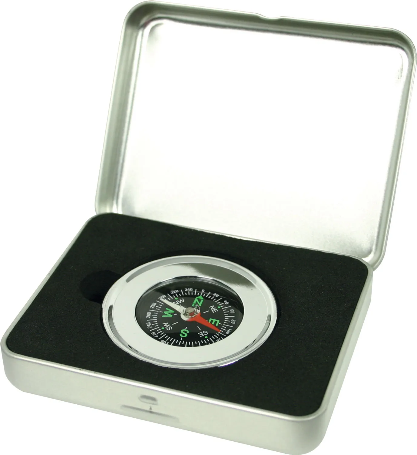 Executive chrome compass, with stainless steel casing. Packed in a tin with EVA insert
