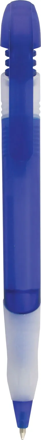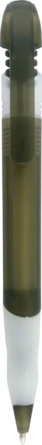 Clcik action plastic pen with a distinctive spiral design at the top. The pen has a frosted coloured barrel and matching clip, along with a white silicon grip and Parker style black refill.