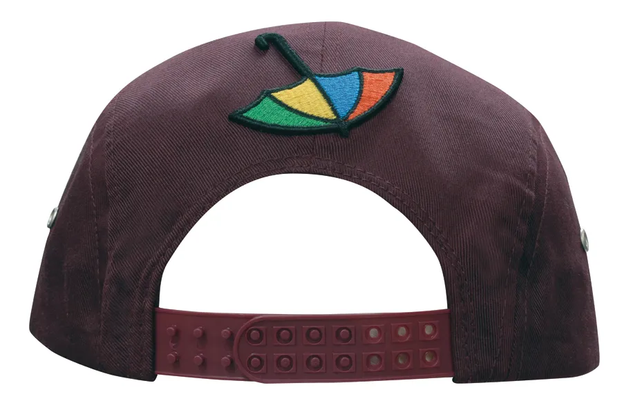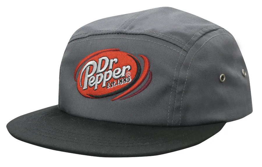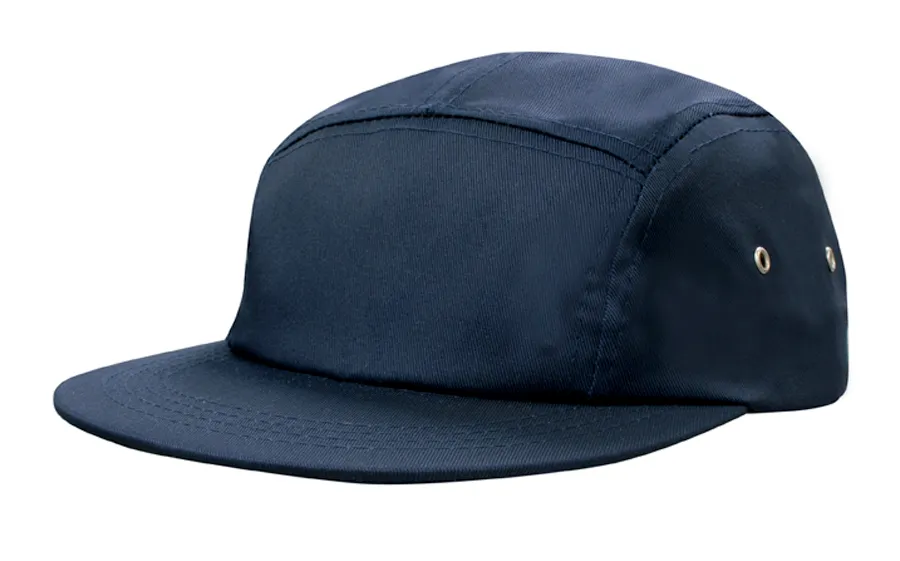 Full Description: 5 Panel Cap Flat Peak Metal Eyelets Twin Hole Plastic Strap