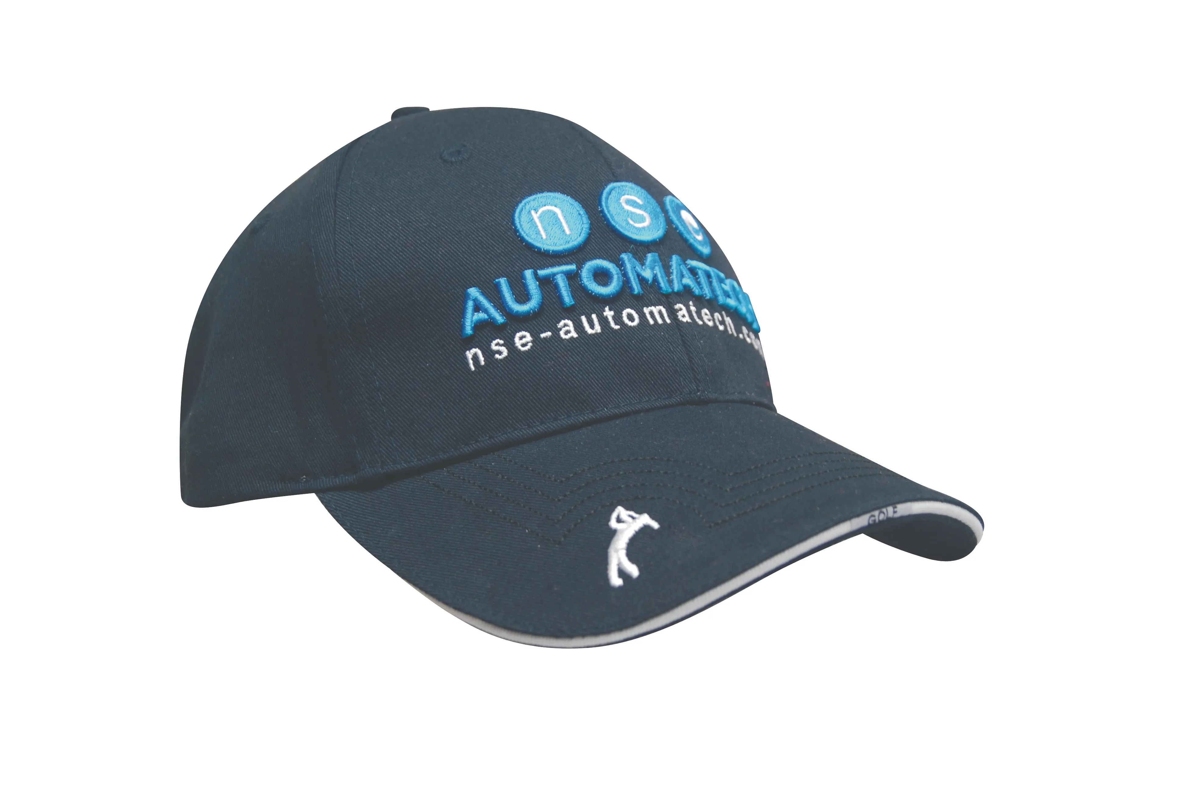 Full Description: Structured 6 Panel Low Profile Cap Pre-Curved Peak with Golfer Embroidery Fabric Strap with embossed buckle & metal slit